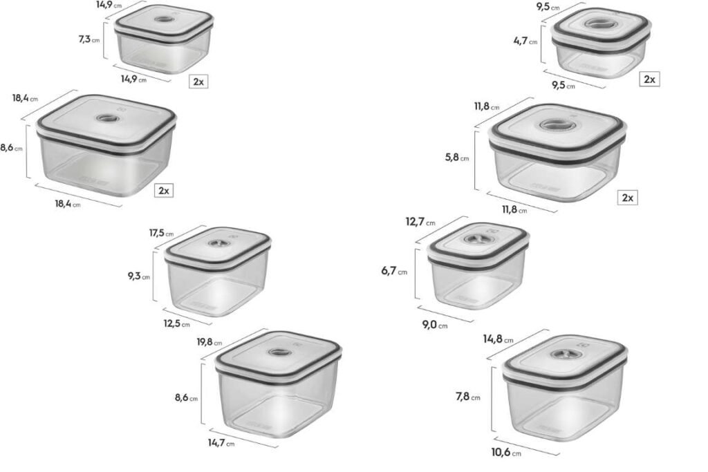 - Potes Grandes: Excelentes para armazenar frutas cortadas ou sobras de jantar (149mm x 149mm x 73mm e 184mm x 184mm x 86mm).